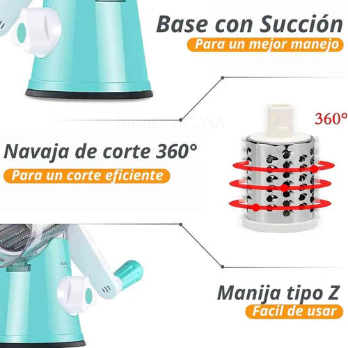 Incluye: 3 cuchillas intercambiables (rallado fino, grueso y rebanado). Incluye: 3 cuchillas intercambiables (rallado fino, grueso y rebanado).