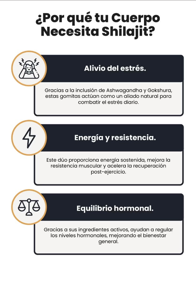 Potencia tu día con 3,000 mg de Shilajit puro combinado con Musli Negro y Gokshura.